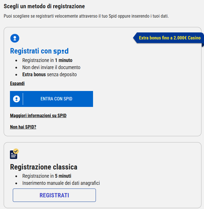 - Un bonus aggiuntivo senza deposito di 2.000€ per chi si registra tramite SPID.