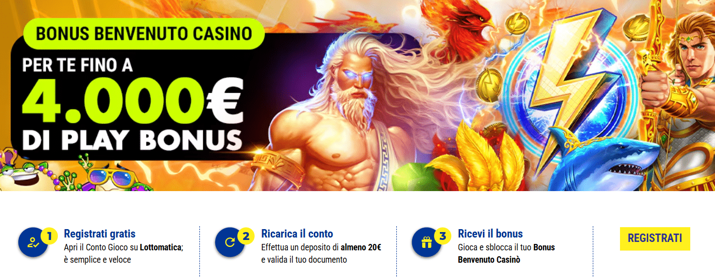 Lottomatica offre un’esclusiva promozione di benvenuto per il Casinò, riservata ai nuovi iscritti che desiderano approfittare di un vantaggio significativo sulle loro giocate. Grazie a questa offerta, è possibile ottenere fino a 4.000€ in Play Bonus Slot, suddivisi in due componenti principali.